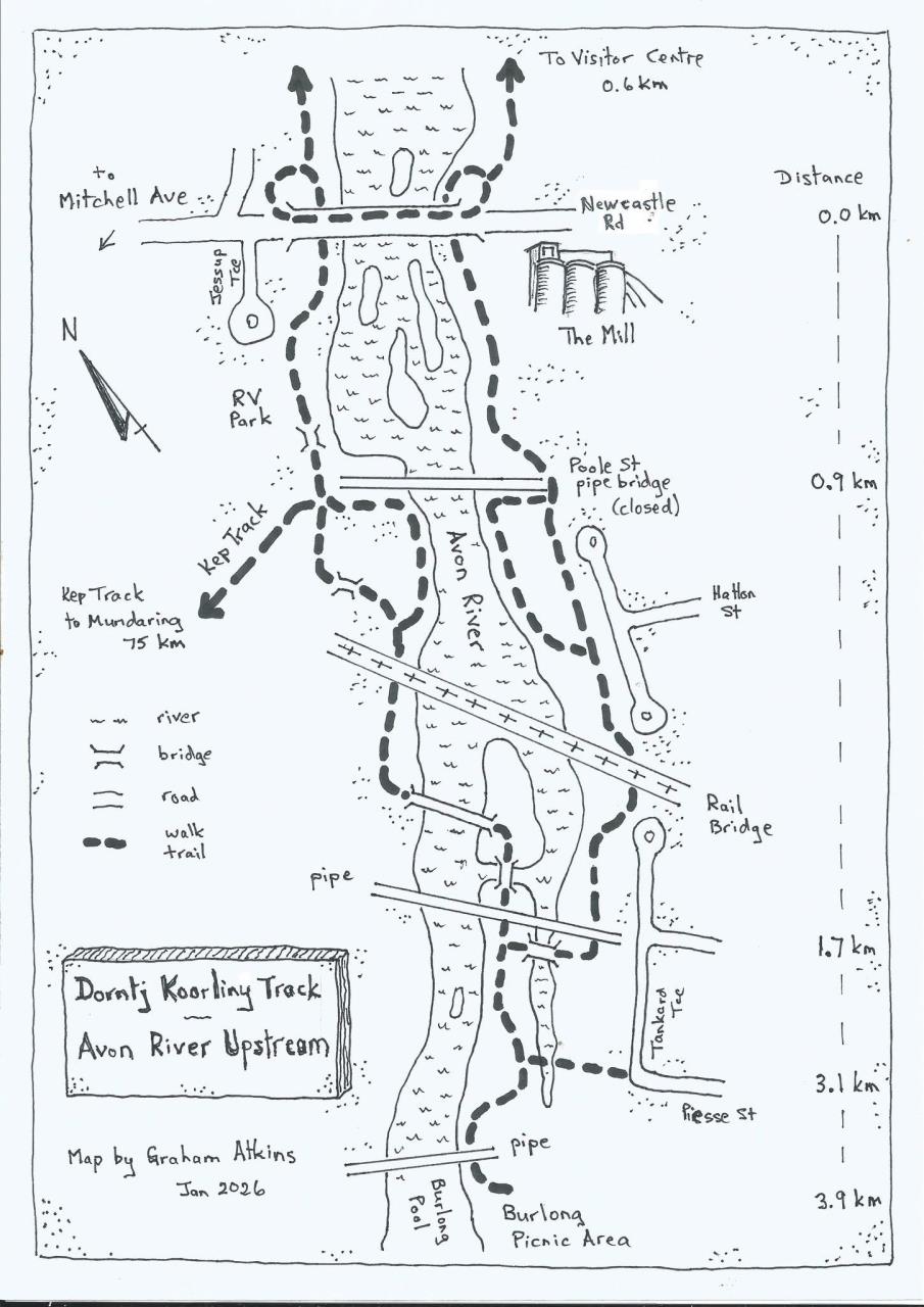 Follow the Avon River on the 18km Dorntj Koorliny (Walk Together) Track. There are many bridges throughout the trail, and you might see some white swans